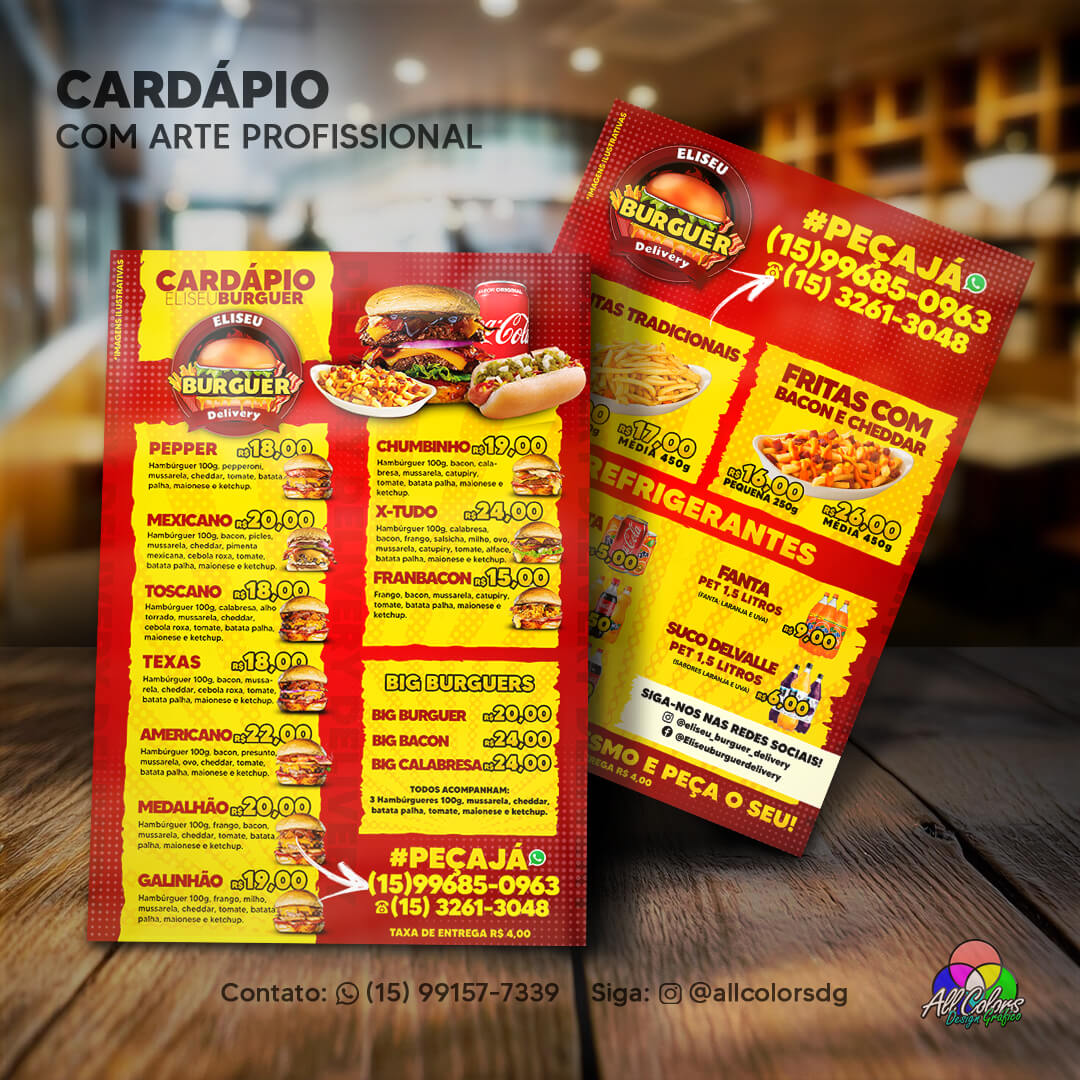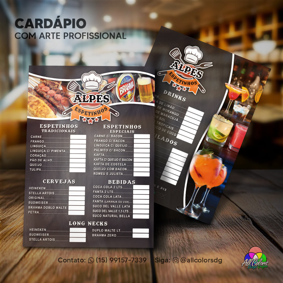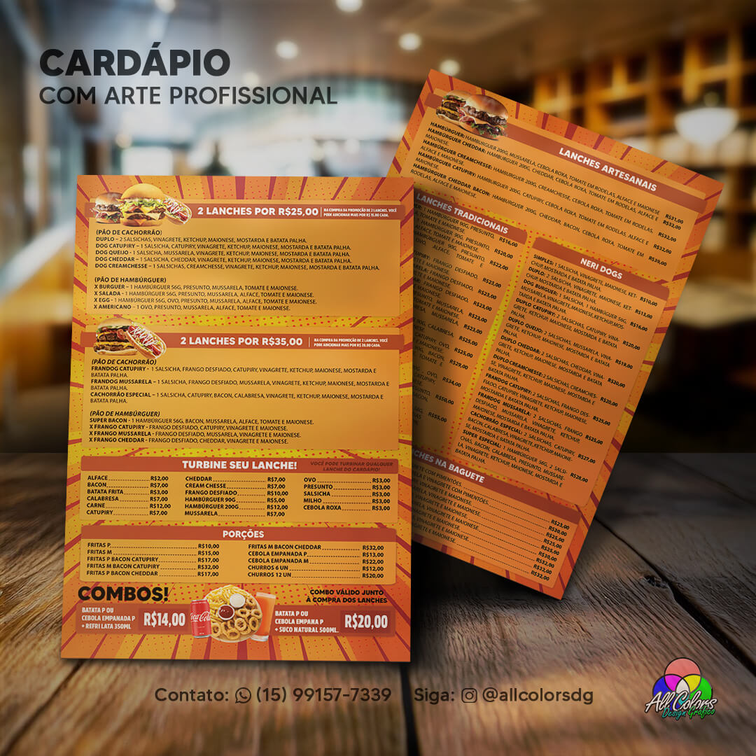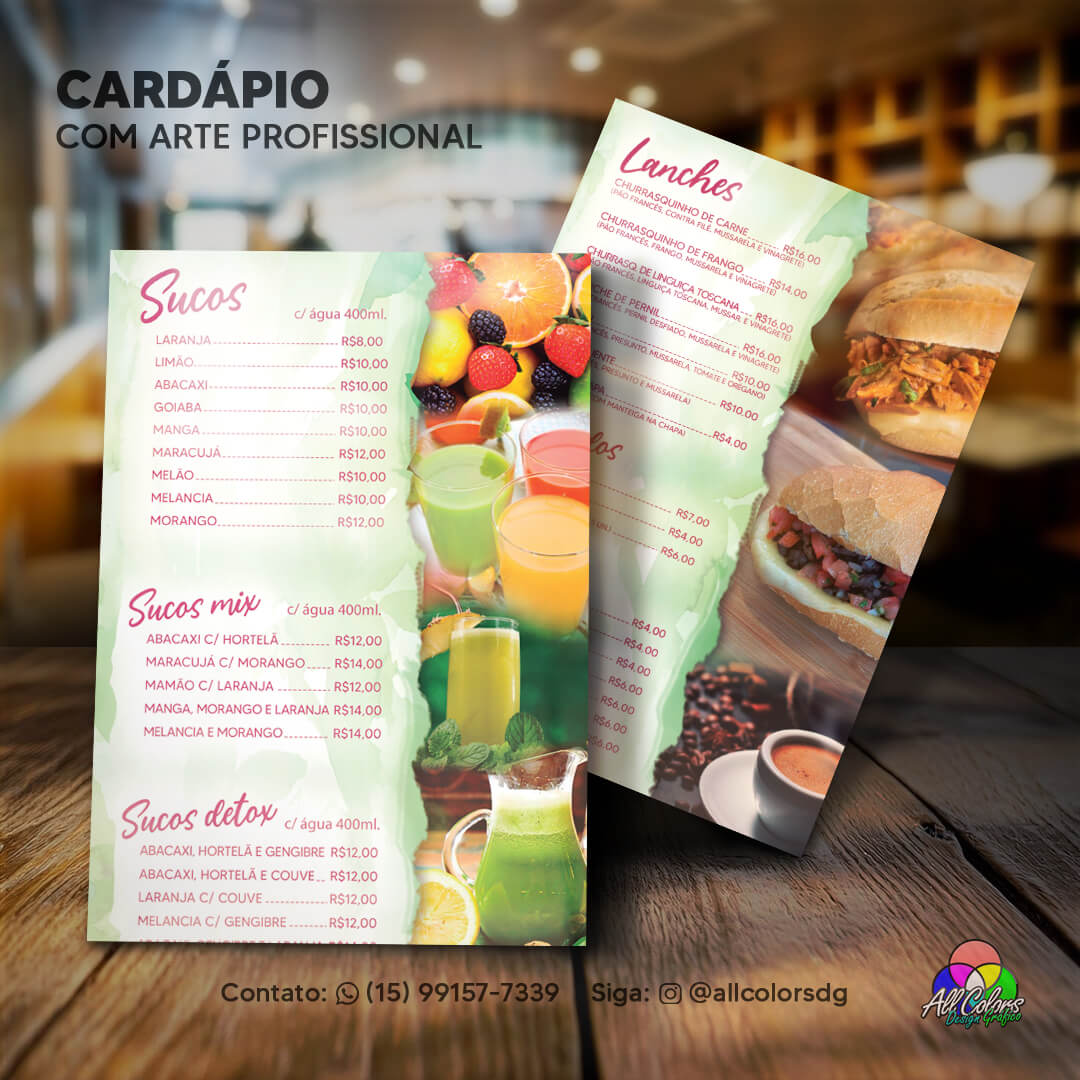 Apresente seus pratos com estilo e clareza com nossos cardápios personalizados. Ideal para restaurantes, cafés e eventos, nossos cardápios são projetados para destacar suas ofertas de forma atraente e organizada.